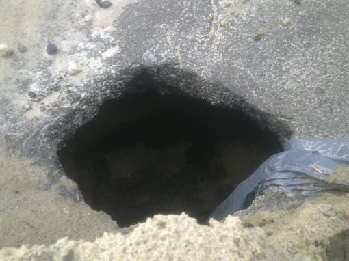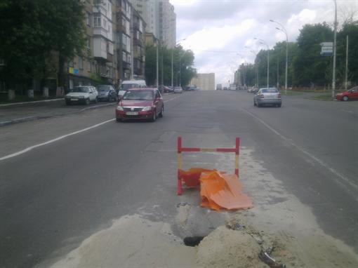 Похоже, что дожди для столицы не прошли бесследно. На проезжей части улицы Васильковской, в Голосеевском районе, вчера образовалась воронка, а под ней огромная пустота. Стоило какому-нибудь автомобилю проехаться по опасному месту и транспортное средство вместе с водителем провалилось бы под асфальт. Благо, этого не случилось. Коммунальщики вовремя установили ограждение, а яму засыпали песком. Правда, этого хватило лишь до сегодняшнего утра, так как ограждение снес автомобиль (после звонка в Голосеевское ДЭУ, коммунальщики вновь установили новое ограждение).