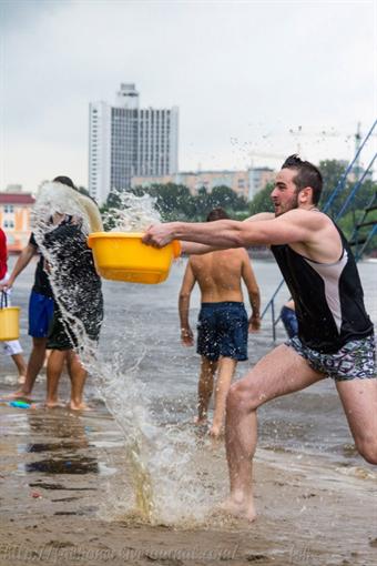 В воскресенье, 2 июня, на пляже около Венецианского моста было мокро. Причем не только из-за дождя, который зарядил сутра и на целый день. Там собралось больше 100 человек, которые, несмотря на нелетную погоду, обливались и брызгались водой: