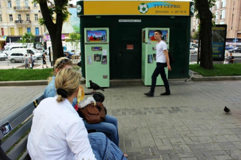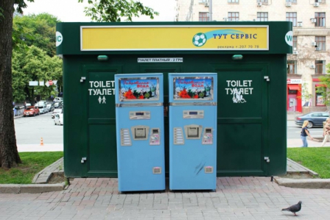 В центре Киева, на Крещатике впритык к туалетным кабинкам установили автоматы по продаже газированной воды.