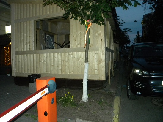 На улице Пушкинской, возле метро «Театральная» один из ресторанов установил прямо на тротуаре огромную летнюю площадку, которая практически полностью лишила возможности киевлян пройти по улице.