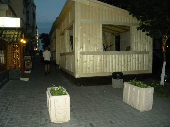 Летняя площадка, загородившая тротуар на улице Пушкинской, представляет из себя достаточно фундаментальное здание в виде сруба. При этом для обычных людей осталось буквально полтора метра тротуара.