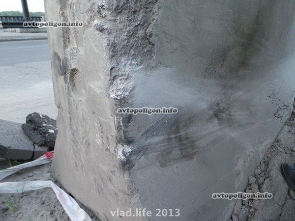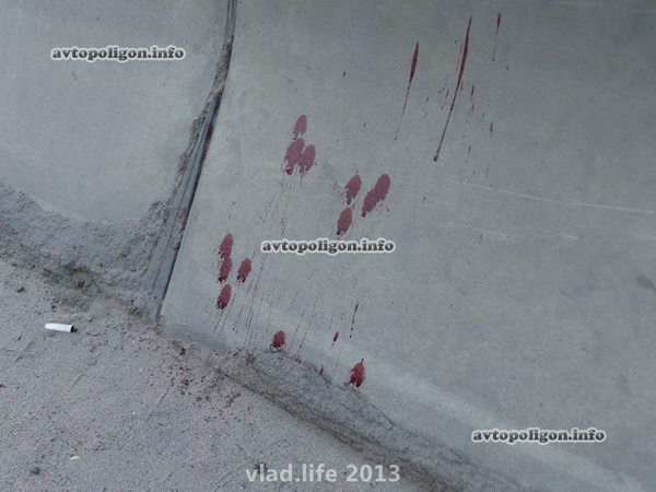 Водитель отвлекся от управления и допустил наезд левой стороной автомобиля на бетонный блок, разделяющий потоки. Автомобиль с вывернутым колесом около 7 метров проезжает по отбойнику, затем падает на правый бок и еще около 10 метров скользит на нем.
