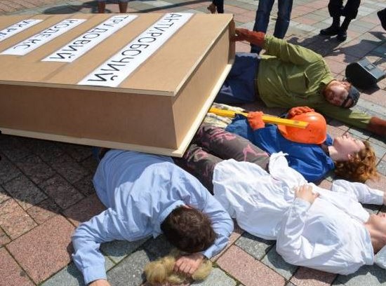 Участники акции показали перфоманс: гигантская книга Трудового кодекса упала на рабочих. Они хотели тем самым наглядно показать, что новый проект кодекса напрямую угрожает интересам миллионов украинцев, сообщает пресс-служба объединения «Боротьба».