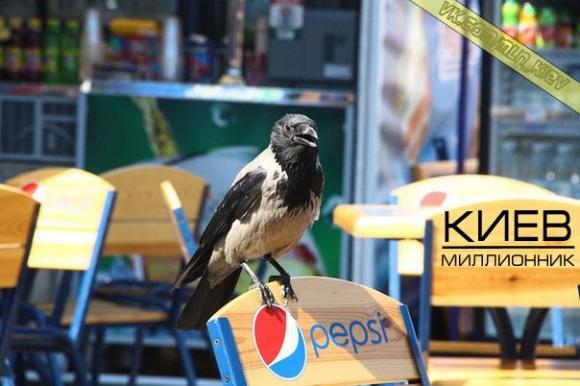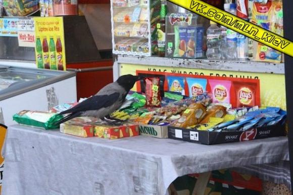 В соцсетях появились фото, как в центре Киева, в одном из уличных кафе, ворона повадилась воровать. На глазах посетителей пернатая воровка схватила с прилавка пачку фисташек и была такова. Продавец за шустрой птицей не успел.