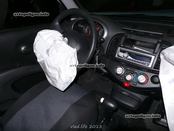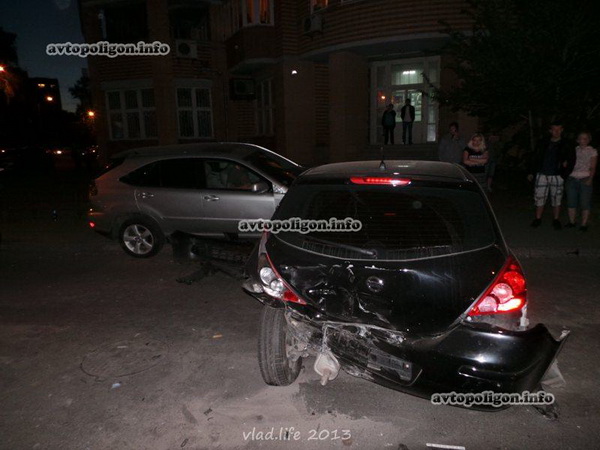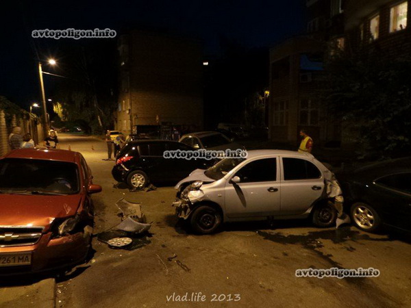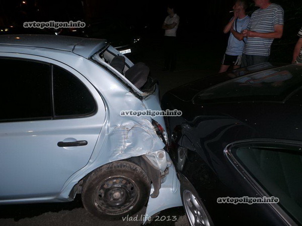 Через мгновение уже неуправляемая Micra врезается во встречный Chevrolet Lacetti. От удара Nissan Micra ударяется левой задней частью о столб, затем отлетает на противоположную сторону и останавливается о припаркованный Mercedes. Nissan Tiida влетает в припаркованный Lexus.