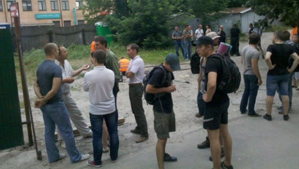 Стройку охраняют 8-10 спортивных молодых людей. Двор защищают до 40 местных жителей и активистов. На данный момент протестующие блокируют вторую детскую площадку и пытаются помешать строителям заварить ворота. Снова приехала милиция - на этот раз не следственно-патрульная группа, а патрульные.