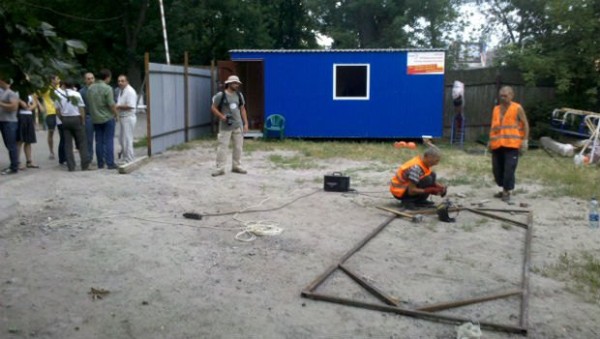 По словам участников акции протеста, застройщики появились на участке сегодня днем и начали устанавливать строительный забор на месте сквера и двух детских площадок. Одну площадку уже снесли - разобрали три качели. Местные жители подняли шум, к ним присоединились общественные активисты, вызвали милицию. Милиция поинтересовалась документами застройщиков и уехала.