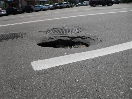 Глубокая воронка образовалась сегодня утром на проезжей части улицы Васильковская, прямо над станцией метро «Выставочный центр». Это уже седьмой провал с начала года, а улицу все не спешат ремонтировать, даже разметку наносят прямо на горбы и трещины.