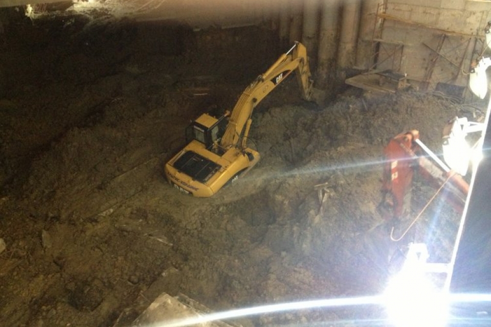 В Киеве на Почтовой площади после дождя в землю по самую крышу провалился экскаватор. Это случилось на выходных рядом со строящимся туннелем, который обещают сдать до 24 августа ко Дню Независимости.