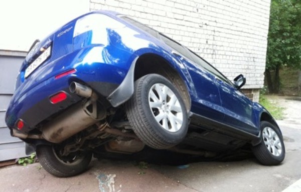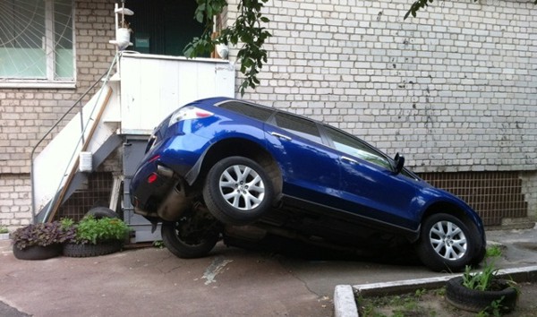 Во время парковки барышня так была увлечена разговором по мобильному телефону, что не заметила перед своей машиной цокольный этаж.