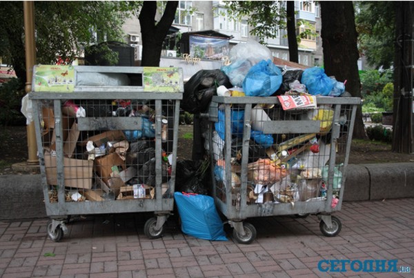 В самом центре Киева прямо на улице Городецкого расположилось много мусорных контейнеров, из которых не вывозят мусор и другие отходы.