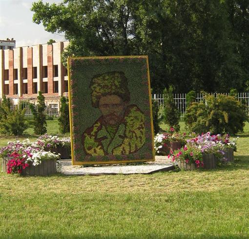 На въезде в Киев со стороны Борисполя, на просп. Бажана – новая цветочная инсталляция. Огромное цветочное панно размеров в 3 кв. метра появилось силами Дарницкого КП по содержанию зеленых насаждений. На нем – во всей своей цветущей красе перед гостями и жителями Киева предстал Тарас Шевченко: