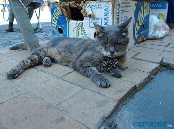 В Киеве на Андреевском спуске возле отного из торговых лотков в сувенирами прикорнул серый кот с бабочкой на шее. Пушистый джентльмен беззаботно спал и оставался равнодушным к повышенному вниманию проходящих мимо туристов к его персоне.