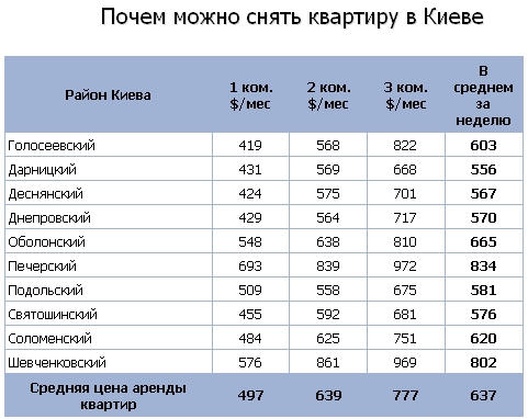 Самые недорогие предложения по аренде квартир - в Дарницком районе (в среднем $556 в месяц), самые дорогие предложения выставлены в Печерском районе Киева (в среднем $835 в месяц.).