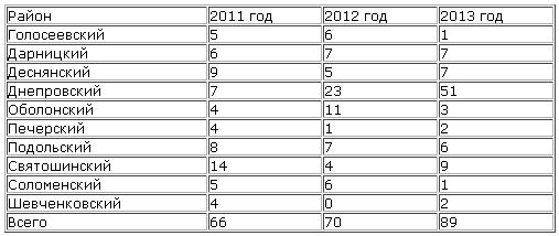 Самым травматичным районом за два последних три года является Днепровский - 57 случаев. Далее следуют Святошинский - 27 случаев, Подольский и Деснянский - по 21 случаю. Меньше дети травмируются в детсадах Шевченковского района - 6 случаев за два года.