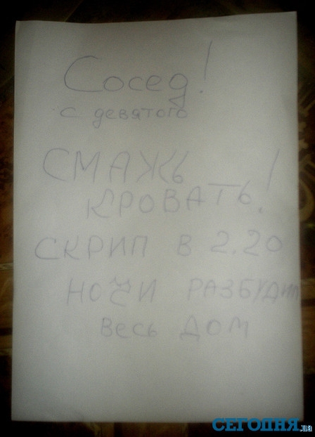 В лифте киевского дома по улице Автозаводской на Оболони появилось забавное объявление. На белом листе бумаги от руки написано: «Сосед с девятого! Смажь кровать! Скрип в 2.20 ночь разбудил весь дом».