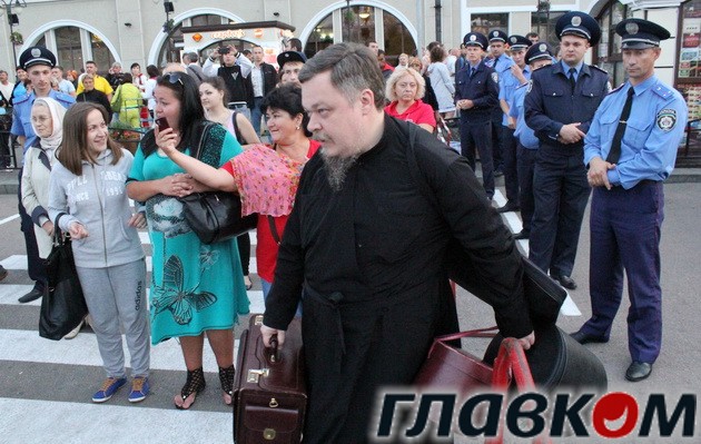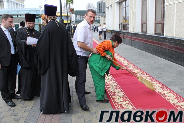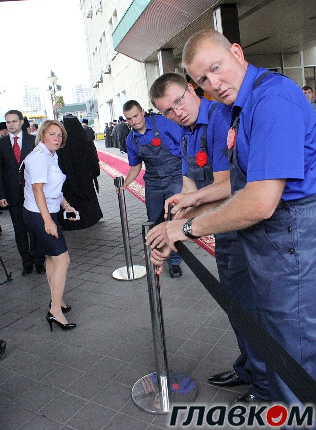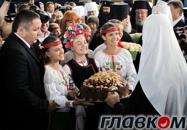 Первым приветствовал московского гостя митрополит Владимир, а потом на российского патриарха набросились украинские чиновники. Каждый из них лично хотел подержаться за Кирилла. Между ними к предстоятелю РПЦ пытались пробиться детки с караваем, они щирою українською мовою приветстовали Кирилла. В этой кутерьме, казалось, бодигарды перестали контролировать ситуацию.