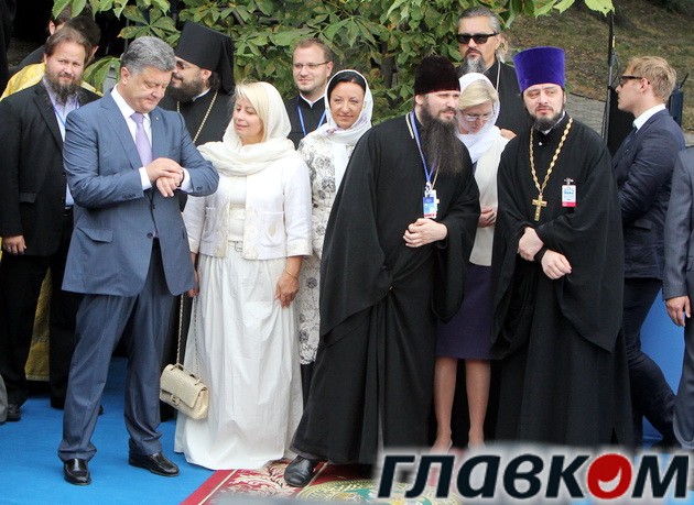 VIP-молебен проходил на Владимирской горке. Президент Украины встречал гостей, кому улыбался, кого целовал, но всем был безмерно рад.