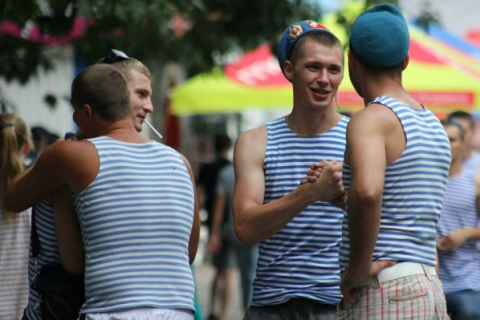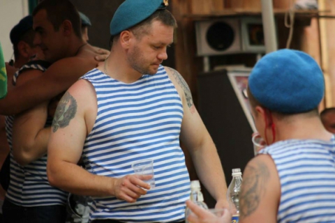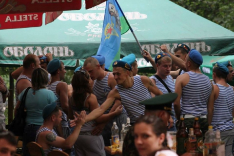 Около 40 десантников заняли одно из кафе в «Гидрозоне» и с тостами «За ВДВ!» шумно отмечают праздник. Некоторые из них даже пытаются бить о головы бутылки, правда, это получается не у всех.