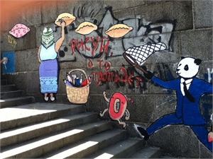 В центре Киева, на одном из спусков к воде на Почтовой набережной появилось новое граффити. На рисунке, в котором пользователи соцсетей уже успели распознать «национальный колорит», изображена бабушка, рисующая на стене пирожки. А рядом – офисный работник с головой панды, который сачком ловит еще не разукрашенную сдобу. Надпись на граффити гласит «Рисуй, а то пропадет».