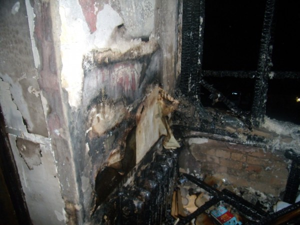 Во время пожара на втором этаже в помещении комнаты огнем повреждена мебель, одежда, закопчены стены и потолок, частично выгорела крыша.