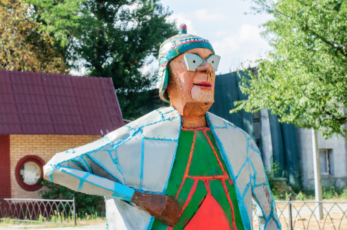 Почти двухметровая скульптура стоит в оборонительной позе, держа в левой руке «кравчучку», внутри которой красуется обезглавленная утка.