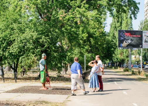 Неоднозначный интерес вызвала композиция у киевлян. «Ставили бы у себя во дворе это чудище», «Страшненькая какая», «Что у нее с лицом» — приговаривают прохожие, с интересом рассматривая монумент. Но и от желающих сфотографироваться рядом с «Бабкой» нет отбоя.
