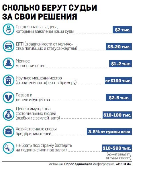 «Судьи могут пробить по разным базам, что есть у него и ближайших родственников, например, могут ли они продать квартиру. Заоблачных сумм не назначают — лучше хоть что-то взять, чем ничего. Но если делом интересуется СМИ, то суммы вырастают в разы. Равно и если решение явно незаконное. За обычное дело в районном суде придется отдать $1,5–2 тыс., в апелляционных — $3–5 тыс. каждому судье. Ну, а в Высшем на мелочи не размениваются и берут по-крупному. Это может доходить и до миллионов», — говорит Монтян. По словам Багирова, от ДТП можно откупиться за $5–20 тыс., от крупного мошенничества, к примеру, со строительной аферой — от $100 тыс. «Мне один человек рассказывал, что потратил на суды $1,5 млн. Часть адвокатам и на судебные издержки. А большая часть — вознаграждения», — говорит Багиров.