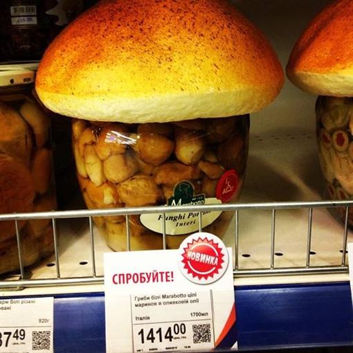 Пользователи сообщества «Блоггерский Киев» поделились фотографией ассортимента одного из столичных магазинов. Горожанам предлагают приобрести белые грибы в банках замысловатой формы по цене «всего» 1414 гривен за 1700 граммов.