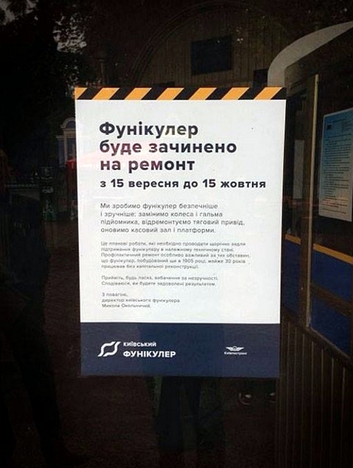 На здании фуникулера в Киеве появилось необычное объявление о закрытии его на ремонт.
