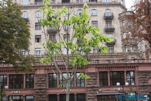 С недавнего времени жители и гости украинской столицы могут наблюдать повторное цветение каштанов. Несколько деревьев вновь распустили листья и соцветия на центральной улице Киева.
