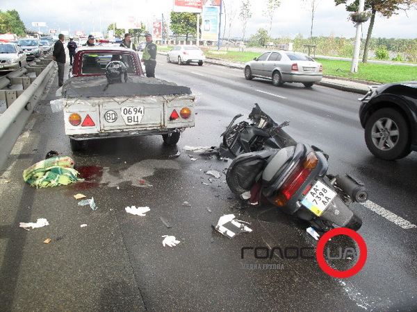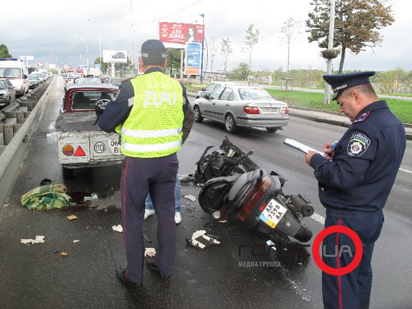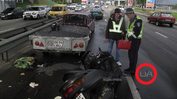 Сегодня, в начале 12-го, в Киеве на Набережном шоссе под эстакадой с Парковой аллеей мотороллер на полном ходу врезался в резко остановившиеся «Жигули» с прицепом. Об этом рассказали очевидцы происшествия.