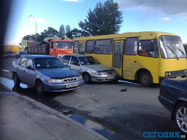 Транспорт, попавший в ДТП, двигался по Броварскому проспекту к «Лесной». Обычно здесь останавливаются маршрутки из Броваров. С маршрутки сняты таблички с номером, разбито заднее стекло. О пострадавших пока неизвестно. Машины стоят без водителей.