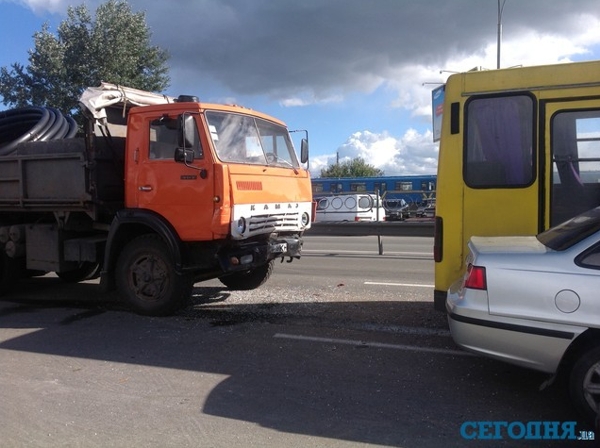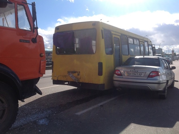 Сегодня днем в Киеве возле станции метро «Лесная» столкнулись автобус, грузовик и легковушка.