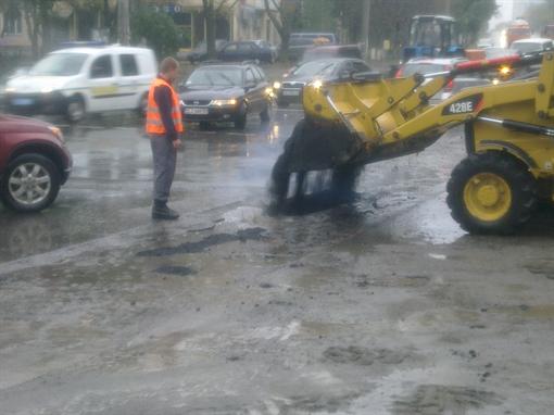 В конце концов, ямы на проспекте были замечены коммунальными службами. Туда завезли асфальт, который рабочие смело засыпали… прямо в лужи и тут же утрамбовывали!