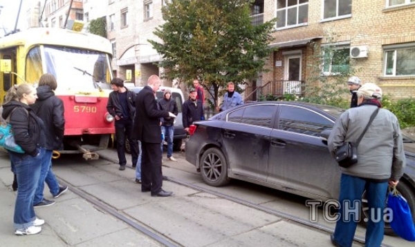 Трамваи на Подоле выстроились в очередь. Лихач бросил автомобиль на путях (ФОТО)