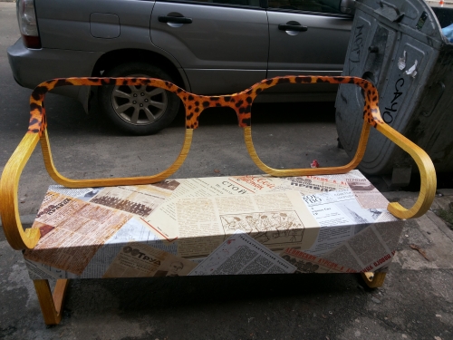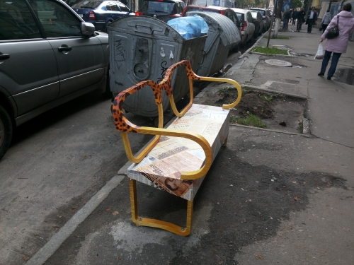 Центр Киева пополнился очередным уличным украшением: на Ярославовом Валу появилась скамейка в виде очков. Сиденья в этой красавицы оклеено советскими газетами.Единственное, что портит скамейкe - соседство с контейнерами мусора и автомобилями.
