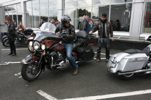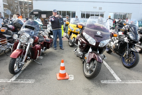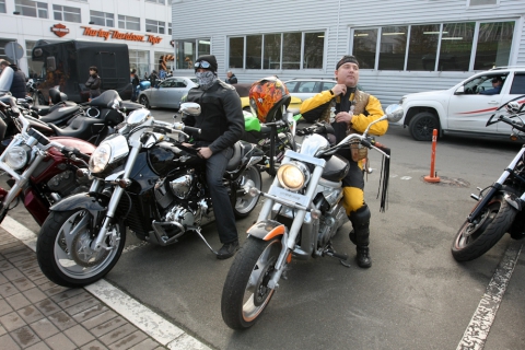 «Нам всем не страшен ни дождь, ни холод, когда речь идет о том, чтобы вместе собраться и погулять. Тем более и событие такое, что грех не приехать», — говорит один из байкеров, который паркует своего «Харлея».