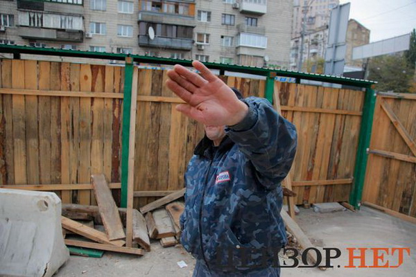 Жители демонтируют строительный забор. Охрана не вмешивалась, а вызванный, очевидно, застройщиком, наряд милиции просто наблюдал за тем, как киевляне выплескивают свою ярость.