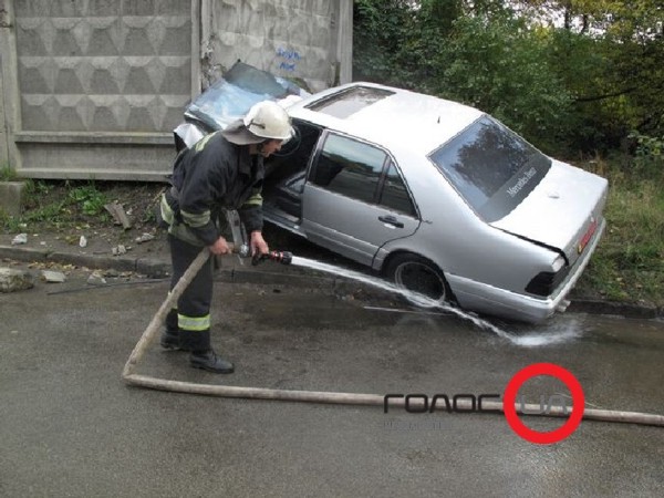 Как оказалось, кроме разрушенной передней части «Мерседеса» был поврежден 90-литровый бензобак и в воздухе запахло бензином. Поэтому срочно пришлось вызывать пожарных, чтобы смыть топливо и уберечь дорогой автомобиль от полного уничтожения.