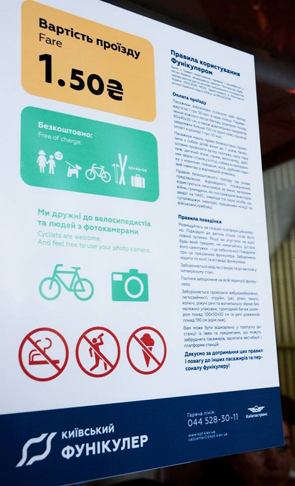 Напомним, что в рамках ремонта вагоны этого вида транспорта перекрасили — теперь они не голубые, а бело-синие, в них заменили колеса, электронное оборудование и систему связи. На внешней стороне вагонов появился новый логотип. Кроме того, на станциях фуникулера развесили новые указатели, изготовленные киевским дизайнером Игорем Скляревским.