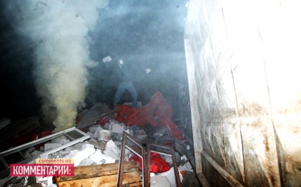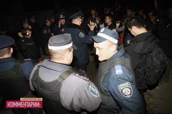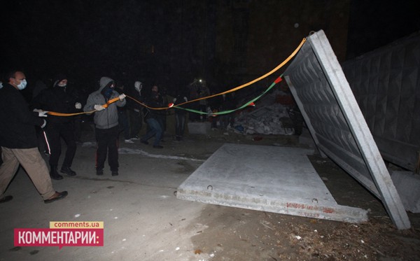 Около 10 милиционеров, присутствовавших на месте, не смогли помешать им ломать бетонный забор. В то же время со стороны стройки в активистов полетели дымовые шашки.