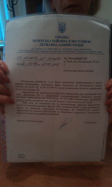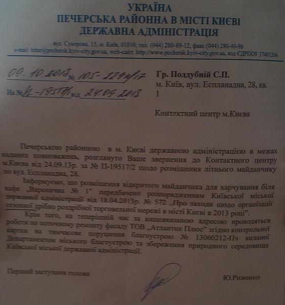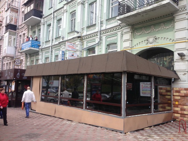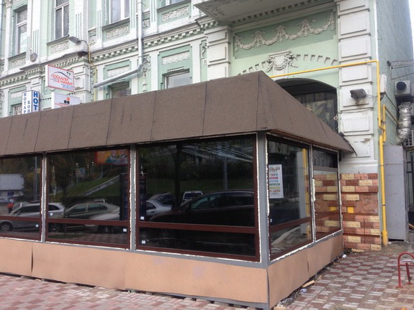 «Никто из жителей нашего дома не давал разрешения, да у нас и не спрашивали, – говорит владелица одной из квартир Светлана. – Слева от входа в дом еще в 2003 году появилась летняя площадка, которая «плавно» превратилась в пристройку. Но этого им оказалось мало – решили поставить еще одну. Как только начались строительные работы, мы позвонили на горячую линию КГГА с жалобами. В результате нам в письменном виде сообщили, что разрешения возводить пристройку рестораторам никто не давал и на самом деле сейчас проводится всего лишь текущий ремонт фасада. Какой еще ремонт?! – негодует киевлянка. – Буквально перед Евро-2012 дом покрасили и поменяли тротуарную плитку – за деньги из бюджета города. Словом, фасад и так был в хорошем состоянии. К тому же проверяющий из отдела благоустройства Печерского района пришел только на следующий день после того, как мы получили «письмо». Получается, что у чиновников ответ был готов заранее?».