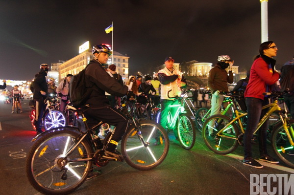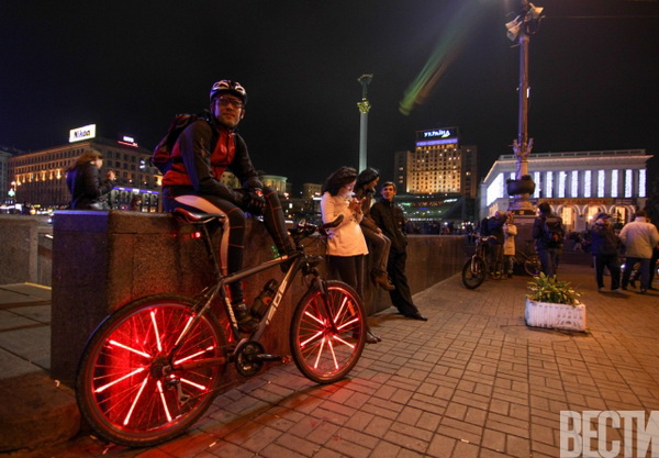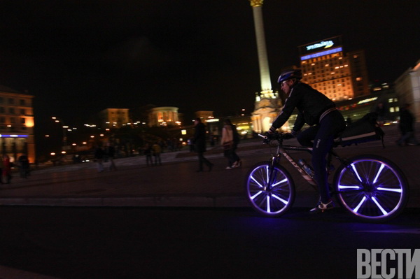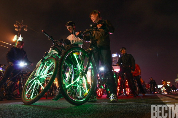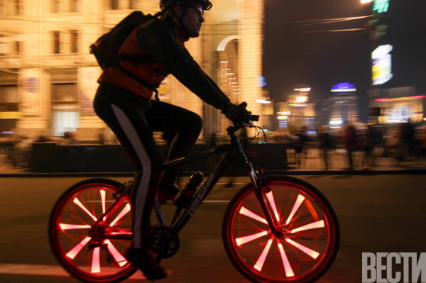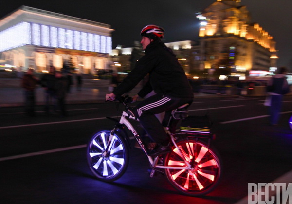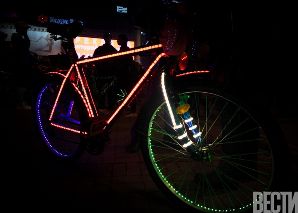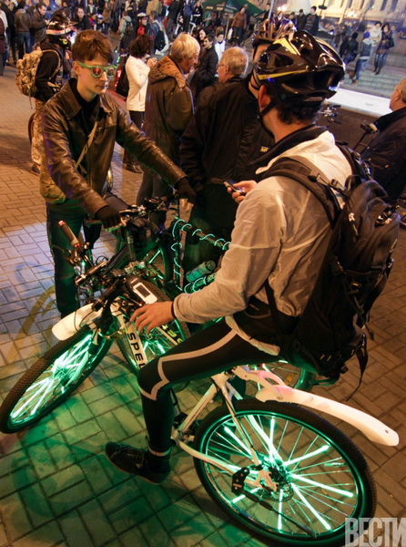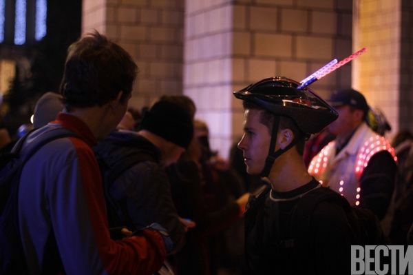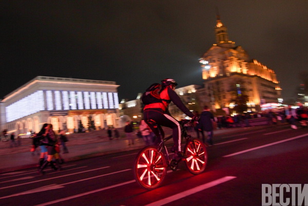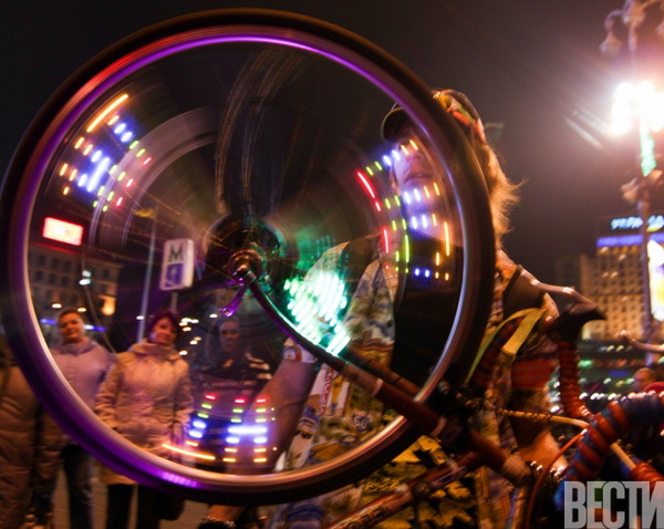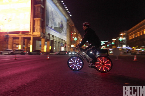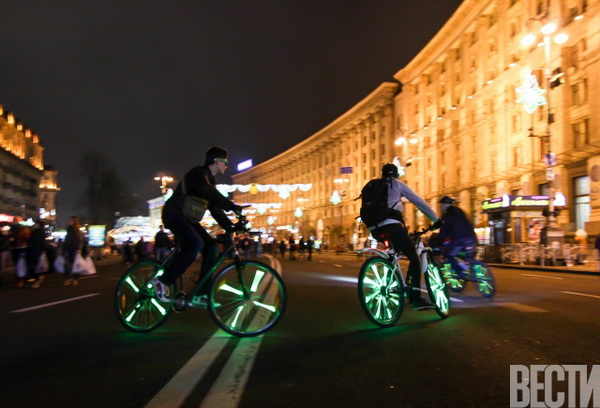 От Главпочтамта по улицам столицы проехались велосипедисты с всевозможным освещением: неоновыми подсветками, гирляндами, фонариками.