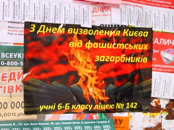 Так, сегодня, во вторник, 5-го ноября, в полдень, когда во всех учебных заведениях, в том числе и в указанном учреждении образования, проходили занятия, школьники 6-го класса бегали по дворам Шевченковского района и расклеивали, где придется, листовки с весьма лаконичным поздравлением: «С Днем освобождения Киева от фашистских захватчиков. Ученики 6-Б класса лицея № 142».