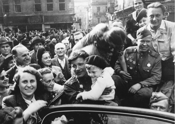 Как доказательство журналист обнародовал оригинал этого фото авторства советского фотографа Александра Егорова, где в верхнем углу видно название магазина латиницей. Как оказалось – это фото улыбающихся пражан, которые 9 мая 1945 года приветствуют автомобиль с советскими воинами.