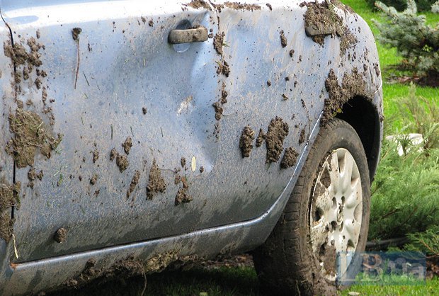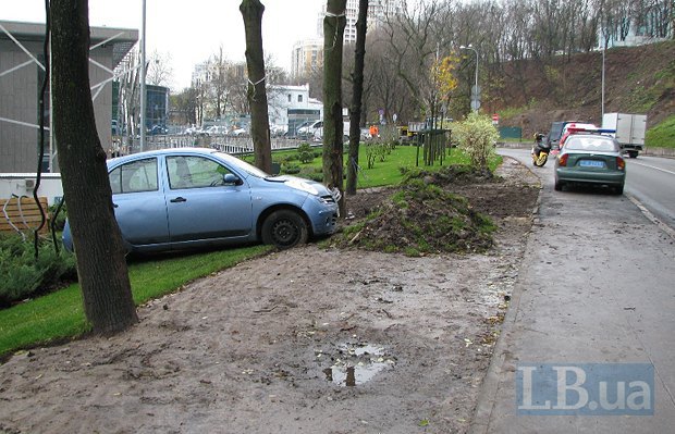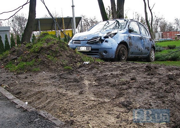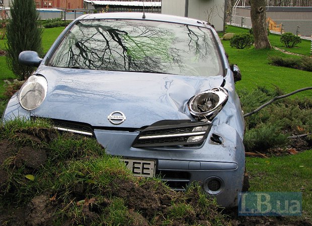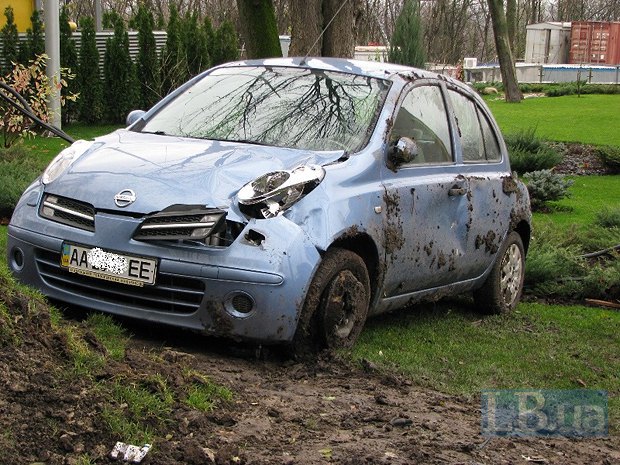 Во вторник утром в Киеве на Парковой аллее вылетел с дороги и перевернулся Nissan Micra.