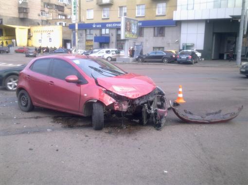 Авария случилась днем на площади Победы в Шевченковском районе. По предварительным данным, водитель «Мазды», выезжала с улицы Саксаганского на площадь Победы. В это время со стороны бульвара Тараса Шевченко, выехал инкассаторский автомобиль «Форд» и столкнулся с легковушкой. Тяжелый «броневик» буквально снес переднюю часть машины, при этом сам лишился переднего колеса. Кто нарушил правила дорожного движения, установит следствие. Пострадавших в ДТП нет.