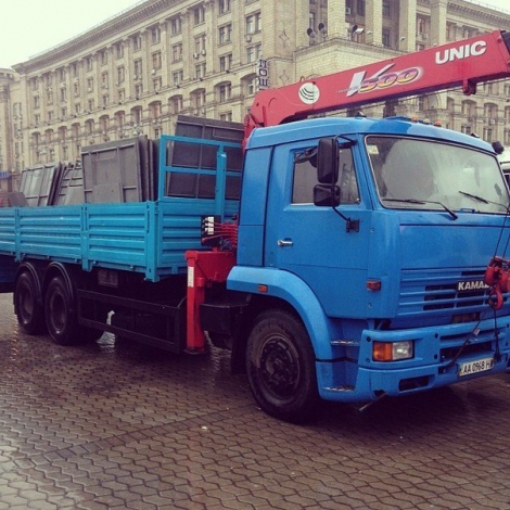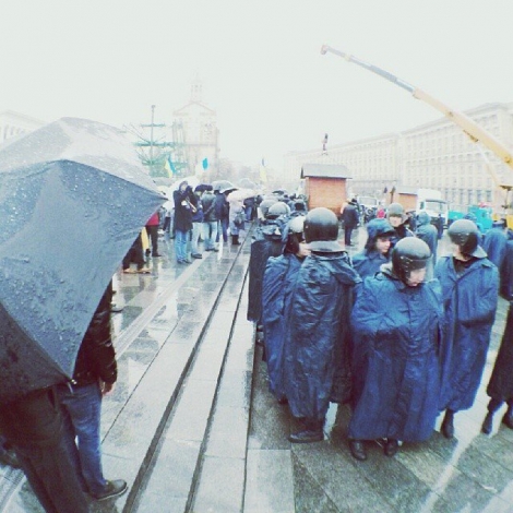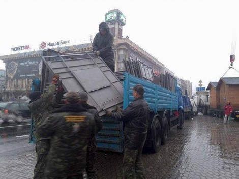 На Майдане – большое количество милиции и «Беркута» в касках. В то же время сюда пригнали строительный кран и устанавливают многочисленные ларьки.