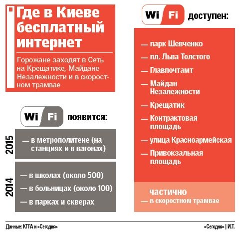 Школы и больницы. «За год мы открыли около 70 точек бесплатного доступа к WiFi (смотри инфографику). На следующий год планируется серьезное расширение. Сейчас у нас 2 оператора-партнера, но надеемся, что их станет больше, после чего мы территориально разделим обязанности между ними и процесс пойдет быстрее. В следующем году мы охватим все крупные парки и скверы, а также все школы и больницы», — рассказал «Сегодня» советник главы КГГА Александр Кубраков. Во все школы WiFi уже начали проводить, а зимой приступят к монтажу и в больницах. В КГГА считают, что это поможет врачам в их работе: они смогут консультироваться с коллегами. С весны бесплатным доступом к интернету воспользуются гуляющие на Оболонской набережной и Пейзажной аллее. В следующем году WiFi появится и в Мариинском парке. В 2014 WiFi-доступ откроют и во всех вагонах скоростного трамвая (сейчас есть в 60 вагонах).